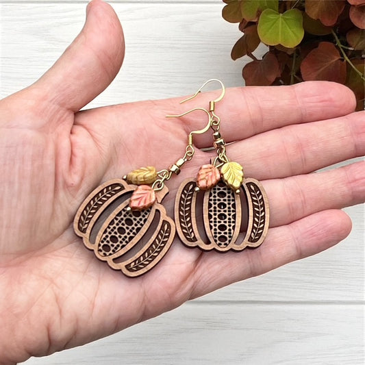 Pumpkin Rattan Earrings with Czech Glass Leaf Charms