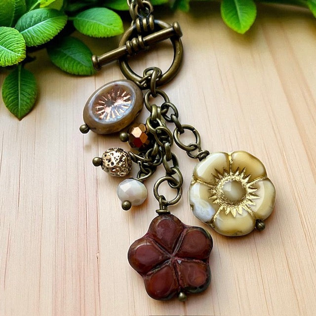 A vintage-inspired charm necklace featuring a mix of floral Czech glass bead charms in warm, earthy tones—perfect for everyday boho style.