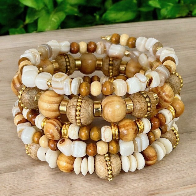 This is a gorgeous one of a kind coil wrap bracelet. Made with warm toned wood beads, shell chips, ivory bone seed beads and various gold metal accent beads. You will be wearing this with everything!